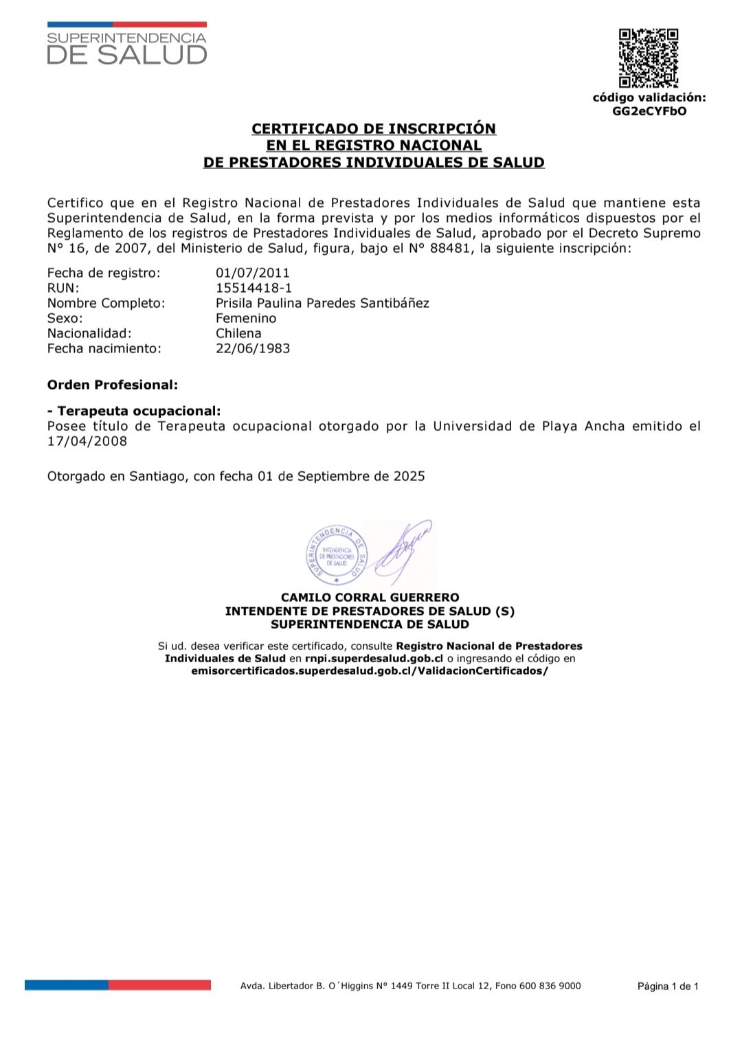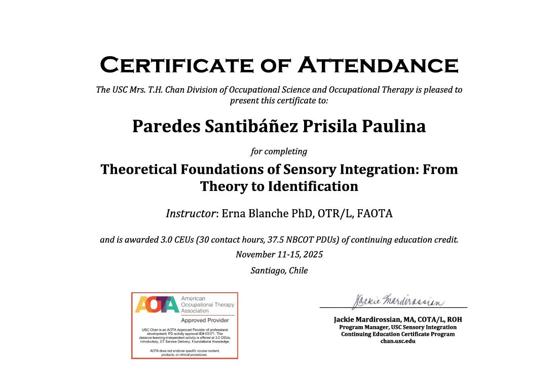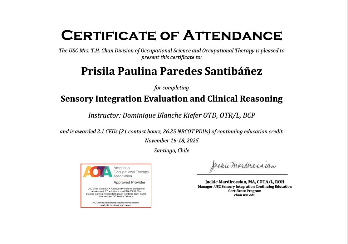 Cuento con formación en Problemas de Alimentación con Base Sensorial y certificación en Integración Sensorial (C1 y C2) por la University of Southern California (USC), actualmente en formación avanzada (C3 y C4), además de especialización en evaluación e intervención del sistema táctil.